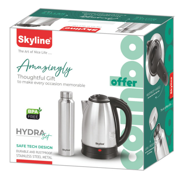 Elevate your hydration game with the Skyline Hydra Set, a premium combo of an electric kettle and a stainless steel bottle. Whether you're at home, the office, or on the go, this dynamic duo ensures hot beverages are always at your fingertips while keeping your water cool and refreshing for hours.